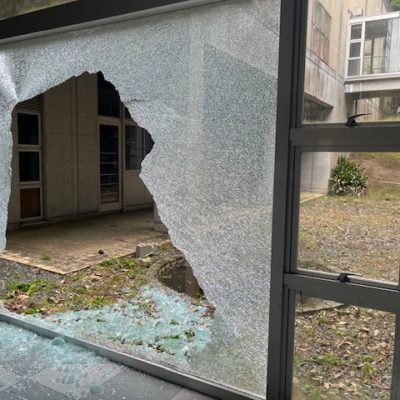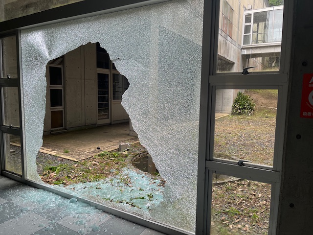 体育館通路の大板強化ガラス、協力会社の皆様と割れ替えしました。